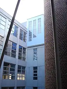 The École Nationale Supérieure d'Architecture de Paris-Belleville was founded by a dissident group of students from the École nationale supérieure des Beaux-Arts,[5] l'atelier collégial 1, led by Bernard Huet, in 1965. In 1969 it was officially recognized under the name UP8 (unité pédagogique d'architecture n°8, architectural teaching unit no. 8), and it has since occupied various re-purposed quarters, including Les Halles until their demolition, as well as a former Meccano factory in the Belleville section of Paris. In 2009 it moved into a purposely designed space, a conversion and partial rebuilding of the former site of the Lycée technique Diderot, also in Belleville. In 1986 it was renamed the École d'architecture de Paris-Belleville and UP7 and UP5 were merged into it.[6] It took its current name in 2005.