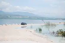 Étang Saumâtre is located on the arid part of the valley Cul-de-Sac, 29 kilometres (18 mi) east of Port-au-Prince in the Ouest department.[3] Its eastern side is part of the border between Haiti and the Dominican Republic; the Dominican city of Jimaní is less than 1 km from the southeast end of the lake.[4][5][6]