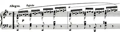 Cortot (1877–1962) states that the first difficulty to overcome is the "crossings of the 3rd, 4th and 5th fingers" and the "strain resulting from the continuous action of the said fingers".[16] Preparatory exercises introduced by Cortot, Gottfried Galston (1879–1950)[17] and Casella[13] always commence with the chromatic scale (top voice) alone without the filling voice. Cortot divides the hand into an "active element" and an "accompanying element". He first insists on practicing chromatic scales with the three outer fingers in all permutations. Galston recommends to hold and press a little object with the thumb and index finger while playing the chromatic semiquavers with the other fingers. Cortot recommends the "pizzicato" notes to be "plucked rather than struck" and Casella wittily compares the three outer fingers to a "motorcycle dragging along its own sidecar [the first two fingers]". Australian pianist Alan Kogosowski (born 1952) recommends keeping 1 and 2 completely relaxed while playing the top voice alone: The "little two-note chords on each beat in the right hand" should be released "as soon as they've been played". The thumb should not be operated vertically to avoid strain and "play its notes extremely lightly –becoming as light as a feather, almost as if it is hardly there at all".[18] Von Bülow orders "the middle harmonies to be played throughout distinctly, and yet transiently [flüchtig]".[9] Galston suggests to accentuate all the upper notes of the two-note chords (played by the 2nd finger) while practicing the right hand.