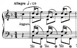 Étude Op. 25, No. 3, in F major, is a technical study composed by Frédéric Chopin in 1836. The romanticized nickname of this piece (not given by Chopin, who thought that idea was repulsive) is "The Horseman" or "The Knight", probably because of its "galloping" style. It is mostly a study in rhythm. The study has four different voices that must be brought out by the performer. The technical figure consists of lateral movements of the hand that must be played with flourish and refinement.[1]