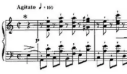 Étude Op. 25, No. 4 in A minor is a technical study composed by Frédéric Chopin. It is marked Agitato at the head. This piece is like a polka. The technique explored in this piece is the performance of off-beat staccato chords set against a regular on-beat bass. This is an example of syncopation. The left hand leaps intervals of up to a tenth (octave plus a third) between the bass and the lowest note of the following chord (and back): this requires a very strong left hand 5th finger. Very often, the performer is required to hold the uppermost note of the right hand in legato while continuing to play the rest of the chord in that hand (and in the left hand) as staccato: this requires a very strong right hand 5th finger. The ending is marked Lento and pianissimo and the chords are all on beat in stark contrast with the rest of the piece.