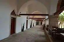 The large courtyard is surrounded by rooms behind arched stoa.[1] The corner rooms are reached by a diagonal passage.[4] There are 28 rooms on ground floor, which have a window next to their door under the stoa facing the courtyard. Entrance to the room is over a step. The fireplace in the room, situated in the wall separating the rooms, is flanked by two small closets.[4]