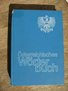 The Österreichisches Wörterbuch (German pronunciation: [ˈøːstəʁaɪ̯çɪʃəs ˈvœʁtɐˌbuːx] ⓘ; English: Austrian Dictionary), abbreviated ÖWB, is the official spelling dictionary of Standard German in Austria, i.e. of Austrian Standard German. It is edited by a group of linguists under the authority of the Austrian Federal Ministry of Education, Arts and Culture (Bundesministerium für Unterricht, Kunst und Kultur) and contains a number of terms unique to Austrian German or that are more frequently used or differently pronounced there. A considerable amount of this "Austrian" vocabulary is also common in Southern Germany, especially Bavaria, and some of it is used in Switzerland as well. The most recent edition is the 43rd from 2017. Since the 39th edition from 2001 the orthography of the ÖWB was adjusted to the German spelling reform of 1996.