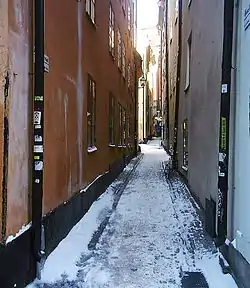 Överskärargränd is an alley in Gamla stan, the old town in central Stockholm, Sweden. Stretching from Västerlånggatan to Stora Nygatan passing on the south side of Gåstorget, it forms a parallel street to Gåsgränd and Sven Vintappares Gränd.