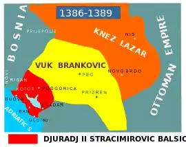 Đurađ received a border with the Ottoman Empire as they took the lands of Vuk Branković in 1392. For opposition to Turkish influence in the region, the Sultan sent an army to invade his lands in May 1392. At the same time in the heat of fighting his competitors Radič Crnojević and Konstantin Balšić, Đurađ was forced to negotiate with the Ottomans for peace terms. In order to protect his wife Jelena from the Ottoman danger Đurađ decided to send her to Dubrovnik in June 1392.[9] He negotiated with Pasha Yiğit Bey, sanjakbey of the Sanjak of Skopje, but the talks were fruitless as the Ottoman demanded half of all his territories around Zeta, including his seat of Ulcinj. In addition to that, in late 1392 the bey managed to capture Đurađ in a battle and released him only after the ransom was paid. When Đurađ was in captivity Radič Crnojević captured his lands around Kotor and proclaimed himself Lord of Zeta and Budva.[10] His wife Jelena was making moves to free him, with the help of the Venetian Republic, but they all reached a moot end. One of the main reasons for that was that his opponent Radič Crnojević expanded his reign vastly and became a Venetian vassal in November 1392. The possibility of this was Đurađ's reluctance to release Philip Bareli, a Venetian citizen, despite many pleas from the Republic. In the heat of struggle amongst feudal lords in Zeta, Philip managed in 1392 to flee from his prison to Durrës, coming into John Thopia's service. On the other side King Stjepan Dabiša dispatched Bosnian Duke Sandalj Hranić from the Hum to take over Đurađ's lands and further agitate Radič Crnojević.