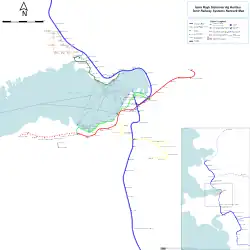 A more ambitious rapid transit system, named İZBAN connects the north of the city, Aliağa to the south terminus of Cumaovası, via Adnan Menderes Airport and several other important financial and commercial areas such as Karşıyaka and Alsancak. The İzban and Metro will provide interchange with each other at Halkapınar station.