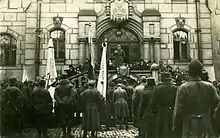 Czechoslovak soldiers occupy Šumperk in December 1918, photo taken the front of town hall