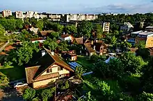 Due to the Soviet principles of urban planning, Žirmūnai, according to the 2001 census data, was among the three Vilnius elderates (the other two being Karoliniškės and Viršuliškės) with the lowest percentage of single-family housing in the city (0.1%). Of the remaining residents, 0.4% owned a share of individual housing, 0.7% lived in hostels, and almost 99% lived in apartments.[42] The scarcity of lots means that the number of single-family dwellings is not likely to increase; a reverse process is taking place: old wooden houses are being demolished, making room for new residential and commercial constructions. As of 2007, there were only a few modern single-family houses in Žirmūnai.