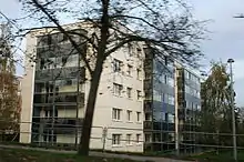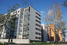 The first microdistrict, or "Žirmūnai I", which is district's middle section, was built in 196267 in accordance with a project by architect Birutė Kasperavičienė, who was awarded the USSR State Prize in 1968, together with architect Bronislovas Krūminis and engineers Ṧmuelis Liubeckis and Vaclovas Zubras;[27] it was the first time this award had been presented to the designers of a large-scale residential construction. The second microdistrict, "Žirmūnai II", which is the southernmost of the three, was built in 196468, its architect being Nijolė Chlomauskienė. And the third, the northernmost microdistrict, "Žirmūnai III" designed by architect Laima Burneikienė was built in 196469 in the site of the former village of Paneriškės.[28] The city district was then named after the formerly Lithuanian[29] village of Žirmūnai (Zhirmuny), now situated 16 kilometres from the LithuaniaBelarus border in the Voranauski District, Hrodna province of Belarus. This village is where Karol Podczaszyński, an architect and designer of Tuskulėnai Manor, was born. Hence the future district's major street Žirmūnų was named after the village as it is seen in the map of 1942[26] and gave its name to the entire district.