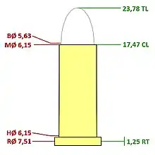![]() .22 Remington Automatic cartridge dimensions in millimeters | ||||||||