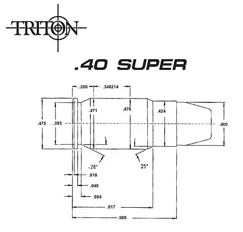 The .40 Super cartridge case was designed for a balance of strength and powder capacity. To maximize bullet pull and overall feeding characteristics, the case has a neck length of .175 in. The shoulder angle is an optimum 25 degrees. The neck yields more precise bullet alignment than can be achieved using a cartridge with a shorter neck. This translates to increased accuracy. The pressure limit for factory .40 Super ammunition from Triton was 37,000 PSI, well below the strength limits of the cartridge case.
