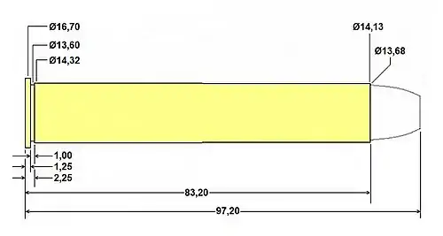 Bullet diameter is typically .512 in (13.0 mm), with weights of 600 to 700 grains (39 to 45 g).