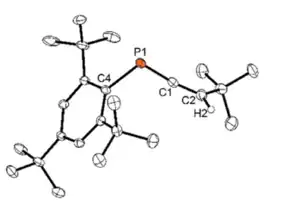 The crystal structure also showed a bent geometry with the P=C=C bond angle at 168.0(3)°.[23] This bent geometry is thought to be a result of both steric and electronic effects. One possible explanation for the observed bent geometry is the bonding model postulated by Lappert et al. which described the bonding between P and the C as singlet states that act in a double π-donor-acceptor fashion.[24][25][26][27]