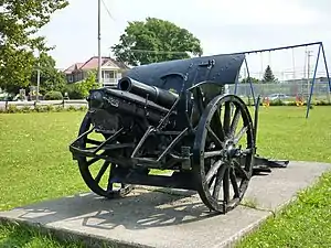 It was originally built by Rheinmetall as the 10.5 cm Feldhaubitze 98, an old-fashioned, fixed-recoil weapon delivered to the German army in 1898; between 1902 and 1904, it was redesigned, by Krupp, with a new recoil mechanism and a new carriage.[2] However, it wasn't accepted for service until 1909, hence the ending designation 98/09. Existing weapons were rebuilt to the new standard. As usual, two seats were attached to the gun shield. There were 1,260 in service at the beginning of World War I.[3] Romania captured around 64 pieces from the German Army during World War I, and put them into service during the interwar years.[4]
