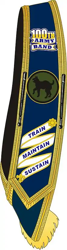 The 100th Army Band has its own collection of heraldric devices,[19] including a baldric, mace, tabard, drum design and unit tab for wear on the uniform.