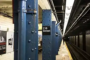 The 116th Street station is a local station on the IND Eighth Avenue Line of the New York City Subway. Located at the intersection of 116th Street and 8th Avenue in Harlem, Manhattan, it is served by the B train on weekdays, the C train at all times except nights, and the A train during late nights only.[4][5][6]
