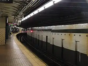 In 1981, the MTA listed the station among the 69 most deteriorated stations in the subway system.[6] The station was renovated in the 1980s, during which two stairs to each platform at the north end were removed and the platforms' original white floor tiling was replaced.[7] The station was damaged in a water main break in 1989.[8] Another renovation later restored the closed staircases and made the station ADA-accessible with the installation of elevators near the middle of the platforms.