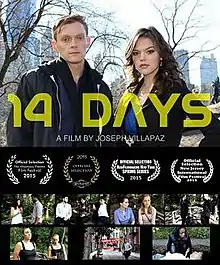14 DAYS is a 2014 American science fiction experimental film, written and directed by Joseph Villapaz. It stars Emily Dennis and Michael Wetherbee and takes place in New York City. It has screened at the Alhambra Theatre Film Festival, Motor City Nightmares, NewFilmmakers Spring Screening Series and at the New Jersey Film Festival. It received 4th Place in the Best Sci-Fi Short Film category at the 2015 International Horror Hotel film festival and an honorable mention in the Best Feature Film category at the Los Angeles Film Review Independent Film Awards.