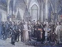 Croatian high nobility members (right) and the plenipotentiaries of Ferdinand I Habsburg (left) at the Parliament on Cetin, by Dragutin Weingärtner