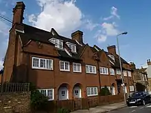 Built in 1906, there is a row of four Arts and Crafts terraced cottages in red brick with two storeys plus attic, each cottage had a two-bedroom flat on the ground floor, and a three-bedroom flat above.