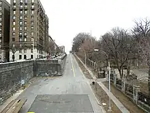 The street consists of upper and lower portions. The upper portion starts on the West Side at Riverside Drive, crossing Broadway, Amsterdam Avenue, and St. Nicholas Avenue. At St. Nicholas Place, the terrain drops off steeply, forming Coogan's Bluff. 155th Street is carried on the 1,600-foot (490 m) long 155th Street Viaduct, a City Landmark constructed in 1893, that slopes down towards the Harlem River, continuing onto the Macombs Dam Bridge, crossing over (but not intersecting with) the Harlem River Drive.[2][3] An unconnected lower section of 155th Street runs at ground level under the viaduct, between a dead-end west of Bradhurst Avenue and a service road of the Harlem River Drive.[4]