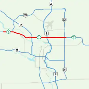 | 18.1 | 11.2 | Split diamond interchange, traffic signals; Hwy 2 exit 225 | |||