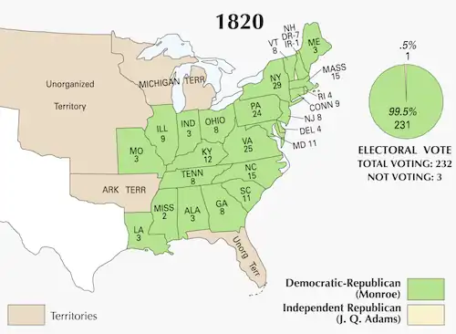 ![]() Presidential election results map. Green denotes states won by Monroe and light green denotes a New Hampshire elector William Plumer's vote for John Quincy Adams. Numbers indicate the number of electoral votes cast by each state. Missouri's statehood status and subsequent electoral votes were disputed, and are therefore not counted in the above infobox. | |||||||||||||||||||||||||||||