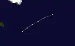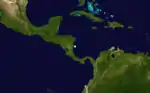 Based on reports of a strong gale, a tropical storm was first tracked about 250 miles (400 km) east-southeast of Barbados early on August 24.[1] It initially headed westward, before re-curving west-northwestward early on the following day. Shortly thereafter, the storm passed through the Windward Islands between Grenada and Saint Vincent and the Grenadines. The storm peaked with winds of 70 mph (115 km/h) while moving northwestward across the Caribbean Sea. It weakened slightly before making landfall near San Pedro de Macorís, Dominican Republic with winds of 60 mph (95 km/h) early on August 27. The storm slowly weakened over Hispaniola and was last noted near Bombardopolis, Haiti later that day.[2]