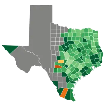 With the state media overwhelmingly behind him,[2] Texas overwhelmingly voted for Breckinridge, who won 75.47 percent of the vote, making Texas his strongest state. Despite the allegiance of Douglas supporters, Bell carried only three counties in the state and it is sometimes thought that the German-American abolitionists in such counties as Gillespie refrained from visiting the polls.[5] Douglas gained a mere 18 votes as a write-in candidate.