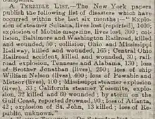 - The steamboat Sultana, carrying 2,300 passengers (and news of Lincoln's assassination), explodes and sinks in the Mississippi River, killing 1,800, mostly Union survivors of the Andersonville Prison.