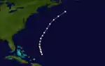 The schooner Pilot's Pride first encountered this hurricane northeast of the Bahamas on October 7.[4] The system moved just west of due north and intensified into a Category 2 hurricane on the following day. Based on ship reports, the hurricane is estimated to have peaked with maximum sustained winds of 105 mph (165 km/h).[5] The bark Marie was damaged by the storm on October 8 and returned to port for repairs.[4] Early on October 9, the cyclone curved northeastward and weakened to a Category 1 hurricane. The storm was last noted to the southeast of Sable Island late on October 10.[5]