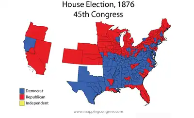 1876 presidential election results. Red denotes states won by Hayes, blue denotes states won by Tilden. Numbers indicate the electoral votes won by each candidate.