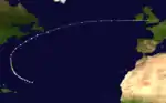 A tropical storm was first seen on August 18 in the tropical Atlantic. It moved to the west-northwest, becoming a hurricane before turning to the northeast. It moved past Newfoundland on August 26.[2] The hurricane caused 80 deaths from swells in the Newfoundland area.[3]