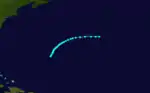 A tropical storm formed west of Bermuda on August 20. It passed about 175 miles to the south of the island before turning northwestward. As the storm travelled north on August 21, it intensified to a 115 mph (185 km/h) Category 3 hurricane. It reached the area of Georges Bank at that intensity on August 22 and damaged several vessels there.[3] On August 23 it weakened to a Category 1 hurricane and became an extratropical storm on August 24 near the Grand Banks.