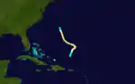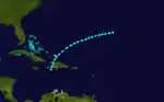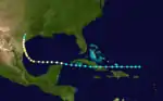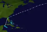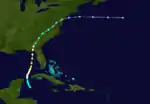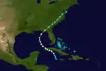 Little more than a day after the dissipation of the previous hurricane, a broad area of low pressure over the western Caribbean Sea developed into a tropical storm while centered about 180 miles (290 km) east-southeast of Punta Allen, Quintana Roo, Mexico.[4][12] Over the next two days, the storm meandered toward and through the Yucatán Channel, gradually intensifying as it proceeded to the north-northwest and north. Late on June 18, the system attained hurricane status off the western tip of Pinar del Río Province, Cuba. The following day, the cyclone turned to the north-northeast, producing "severe gales" (47–54 mph, 76–87 km/h) over the waters off Cuba and Jamaica, as reported by ships.[14] At 00:00 UTC on June 20, the storm reached its peak intensity of 100 mph (160 km/h), and shortly afterward its forward speed accelerated. At 11:00 UTC on June 21, the cyclone made landfall a short distance east of St. Marks, Florida, as a Category 2 hurricane.[4] The storm gradually decreased in intensity over the next day and a half as it crossed the Southeastern and Mid-Atlantic states. By 18:00 UTC on June 23, the system passed about 70 miles (110 km) southeast of New York City and curved to the east before dissipating a day later.[4]