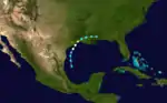 Early in June, unsettled weather prevailed over the western Caribbean Sea, causing heavy rain and strong winds over Jamaica as early as June 7–8.[12] However, ship reports and data from weather stations first confirmed that a low-pressure area formed off the coast of South Texas.[13][14] Based on the data, HURDAT analyzed that a tropical storm formed about 140 miles (230 km) east-southeast of La Pesca, in the Mexican state of Tamaulipas, on the morning of June 13.[4] Moving generally northward at first, the cyclone quickly intensified through the day as it gradually turned to the north-northeast, paralleling the Texas coast. By 06:00 UTC on June 14, the cyclone already attained hurricane status, and its parabolic path increasingly bent to the northeast. Around 16:00 UTC, the cyclone attained its peak intensity of 100 mph (160 km/h), equivalent to a modern-day Category 2 hurricane, and made landfall just east of High Island, Texas. The cyclone rapidly weakened as it headed inland to the east-northeast, crossing south-central Louisiana as a tropical storm on June 15. Reanalysis in the 1990s determined that it dissipated about 20 miles (32 km) east-southeast of Hattiesburg, Mississippi, by 18:00 UTC on June 15.[4][12]