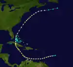 On August 15 a hurricane was seen 90 miles northeast of Barbados. On August 16 it passed over the island of Saint Vincent as Category 2 hurricane. The hurricane passed north of Grenada and continued westward towards the coast of Venezuela, bringing a heavy gale, and some damage, o Curaçao before curving north. Around midnight on August 19 it hit Jamaica, still at Category 2 intensity. The island experienced winds of 110 mph (180 km/h) throughout August 19 and 20th. The hurricane approached the south coast of Cuba as a major Category 3 hurricane on August 21. It crossed Cuba over the central province of Ciego de Ávila before exiting the island near Moron on the north coast. The hurricane then passed over Nassau on the night of August 22. It quickly moved northeastward, and travelled parallel to the east coast of the United States, still at Category 2 intensity, before it weakened and dissipated south of Newfoundland on the August 27.[3] Damage was extensive at several of the locations impacted by the hurricane and some fatalities occurred on St. Vincent, Jamaica and possibly Cuba. Throughout the south of St Vincent, damage was extensive with many injuries and some fatalities reported. Thousands of trees were blown down and 300 homes destroyed on the island. At Jamaica crops and plantations were destroyed and some ships wrecked in Kingston harbour. In Cuba hundreds of homes were blown down, many trees were uprooted and some areas flooded. In the Bahamas, several sailing ships were blown ashore, both at Nassau and at Andros and at the Berry Islands.[3]