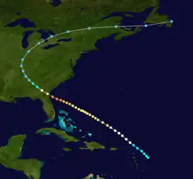 Although the steamship Philadelphia first encountered this storm north of Puerto Rico on September 27, reanalysis by meteorologist C. J. Neumann, et al. in 1993 began the track for this system about 200 mi (320 km) east of Guadeloupe two days earlier.[11][2] Traveling northwest, the storm intensified into a hurricane on September 26 and then into a Category 2 hurricane on September 27. While nearing the coast of the Southeastern United States, the cyclone became a Category 3 hurricane early on October 1 and then a Category 4 hurricane the next day. Around 12:00 UTC on October 2, the storm peaked with maximum sustained winds of 130 mph (215 km/h) and a minimum barometric pressure of 938 mbar (27.7 inHg). The hurricane then made landfall on Cumberland Island, Georgia, four hours later at the same intensity. Early on October 3, the system weakened to a tropical storm over west-central Georgia and a tropical depression over northeastern Alabama several hours later. The cyclone turned northeastward over Indiana and then east-northeastward over Ontario. After emerging into the Gulf of St. Lawrence, the storm struck Newfoundland on October 6 and promptly dissipated.[2]