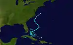 A ship in the western Caribbean Sea reported a tropical storm on October 2.[10] The storm moved north-northwestward and entered the Gulf of Mexico early on the following day. Late on October 3, it peaked with maximum sustained winds of 60 mph (97 km/h). The storm re-curved eastward while situated over the northeastern Gulf of Mexico. At 0000 UTC on October 5, this system made landfall in modern-day Largo, Florida at the same intensity. Thereafter, the storm headed northeastward, until becoming extratropical early on October 6, while located offshore Georgia.[2]