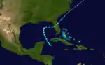 A ship observed a tropical storm north of Panama on November 7. The storm strengthened and headed northeastward across the central Caribbean Sea. It curved northward on November 8, around the time of peaking with winds of 65 mph (105 km/h). Later that day, the storm made landfall in Saint Thomas Parish, Jamaica at the same intensity. Thereafter, the system weakened and struck extreme western Santiago de Cuba Province, Cuba with winds of 50 mph (80 km/h) on November 9. It continued to weaken while crossing the island and emerged into the southwestern Atlantic Ocean later that day. The storm curved northeastward and passed through the Bahamas on November 10. It then weakened to a tropical depression, several hours before dissipating about 385 miles (620 km) southeast of Bermuda.[2]