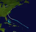 After a three-month lull, the next tropical storm was first observed about 420 mi (680 km) northeast of Barbados on September 8.[3][4] The storm moved northwestward for several days and slowly strengthened. By 12:00 UTC on September 12, the system became a hurricane. Six hours later, it peaked with maximum sustained winds of 80 mph (130 km/h). The hurricane made landfall on Cedar Island, South Carolina, at the same intensity around 13:00 UTC on September 14.[4] A barometric pressure of 985 mbar (29.1 inHg) was observed at landfall, the lowest in relation to the system.[9] About five hours later, the cyclone weakened to a tropical storm and curved sharply northeastward. Weakening and losing tropical characteristics, it transitioned into an extratropical cyclone over the Delaware Bay early on September 15. The remnants briefly restrengthened into a powerful extratropical cyclone, equivalent to a Category 1 hurricane, before dissipating over Nova Scotia later that day.[4]