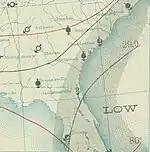 The first tropical cyclone of the season developed on August 23, in the eastern Caribbean Sea.[4] Not believed to have strengthened further, the storm tracked west-northwestward and struck southwestern Hispaniola. It quickly weakened to a tropical depression as it turned more toward the northwest and crossed northern Cuba. On August 26, the depression passed through the Bahamas, east of the Florida Peninsula. Heading due north, the storm had transitioned into an extratropical cyclone by the next day.[5] An area of high pressure to the north and east of the storm was said to have prevented it from recurving out to sea,[4] and the cyclone skirted the eastern coast of North Carolina before being listed as dissipated east of the Delmarva Peninsula. The storm reportedly caused heavy precipitation on August 29 and 30 in Georgia and the Carolinas, while ships at sea reported high winds, rough seas and heavy rainfall.[5]