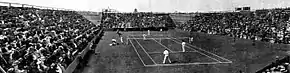 For the first time, however, teams were allowed to use substitute players in dead rubbers, with the United States playing Maurice McLoughlin in singles after Australasia had clinched the final. The final also marked the first time a tie was played in New Zealand, when it was played at Lancaster Park in Christchurch.[3] Anthony Wilding, whose home city was Christchurch, and Australian Norman Brookes won the 1907 tournament for Australasia.[4] With Wilding being absent in Europe for the 1911 competition, the chances of the Australasian team were weakened.[5]