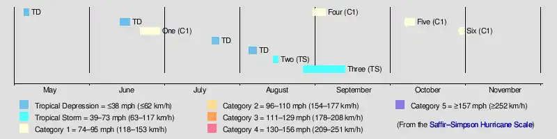Of the season's ten tropical cyclones, six became tropical storms and four strengthened into hurricanes. Furthermore, none of these strengthened into a major hurricane—Category 3 or higher on the modern-day Saffir–Simpson hurricane wind scale—marking the sixth such occurrence since 1900.[1] The strongest hurricane of the season peaked as only a Category 1 with winds of 85 mph (137 km/h). That system left five deaths and at least $4 million in damage in North Carolina. The first hurricane of the season also caused one fatality in Texas, while damage in South Carolina from the fifth hurricane reached at least $75,000.