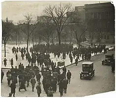 On the morning of Wednesday, December 5, about 15,000 unionists met at the Saint Paul Auditorium and heard speeches from notable labor activists, including Mayor Van Lear.[37] The unionists pledged their support to the streetcar union members and demanded the firing of both McGee and Charles W. Ames from the MCPS.[37] Additionally, they voted to wait until December 11 for federal intervention, vowing to gather again and vote on a general strike if intervention had not occurred by that time.[37] In a bid to show he was not antilabor, Governor Burnquist fired Ames, though kept McGee on the commission.[37] Several days later, on December 7, APL members learned through espionage that some machinist union members were planning a possible statewide general strike.[41] A general strike in the Twin Cities was officially declared to begin at 10:00 a.m. on December 13.[42][43] The union stated that they expected 30,000 people to go on strike, prompting fears that martial law would be declared.[42][44] Governor Burnquist ordered that all liquor stores be closed and instructed the sheriffs of both Hennepin and Ramsey counties to maintain order.[42] By noon, over 10,000 people had walked out of their jobs.[42][43] By that time, Secretary Baker, acting under the authority of United States President Woodrow Wilson, telegraphed William Bauchop Wilson of the President's Mediation Commission to investigate the developments in the Twin Cities, citing a "federal interest" in the matter.[42] Having achieved their goal of federal intervention, at 1:30 p.m., E. G. Hall, the president of the Minnesota chapter of the AFL, called off the strike.[42] In total, this general strike had lasted less than four hours,[32] with no reports of violence.[42] Governor Burnquist, while agreeing to meet with federal mediators, voiced stern opposition to the federal government's decision, calling it an overreach of their power.[42]