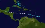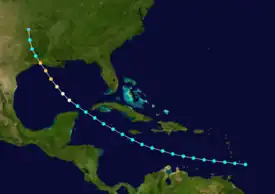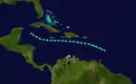 A tropical wave developed into a tropical storm just north of Barbados early on September 9.[3] Later that day, the storm crossed the Windward Islands, passing between Martinique and Saint Lucia. While moving west-northwest to westward across the Caribbean, the cyclone only strengthened slightly. Early on September 11, the storm peaked with maximum sustained winds of 45 mph (75 km/h).[4] In real time, it was believed that the cyclone curved nearly due northward on September 12 and crossed Haiti before dissipating near Great Abaco Island on September 14. However, observations from the Greater Antilles suggest that the storm continued westward.[3] Upon reaching the northwestern Caribbean on September 14, the storm weakened to a tropical depression, before dissipating about 170 mi (270 km) west of the Cayman Islands around 12:00 UTC.[4]
