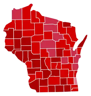A poll by the giant Rexall drug store chain – which in 1916 had been accurate enough to predict Wilson's razor-thin wins in New Hampshire and California[13] – suggested Harding would win 382 electoral votes,[14] and at the end of October, although no more opinion polls had been published, most observers were even more convinced that the Republicans would take complete control of all branches of government.[15] Polls were similarly confident in Wisconsin, despite forecasts of a big vote for imprisoned fifth-time Socialist nominee Eugene V. Debs.[16] Expectations of a landslide were fully realized: whereas Charles Evans Hughes had carried Wisconsin by only 6.59 points in 1916, Harding won this arch-isolationist state by a nine-to-two majority. Wisconsin would prove to be Harding's fourth strongest state in the 1920 election terms of popular vote percentage after North Dakota, Vermont and Michigan.[17] Wisconsin would prove Cox's weakest state in the largest landslide loss in United States presidential election history, and Debs' strongest state in his last campaign for the presidency.[17] Despite Debs' substantial vote, Harding carried all Wisconsin's counties with absolute majorities, becoming the only candidate to ever win every single Wisconsin county in a presidential election, and Cox cracked twenty-three percent of the vote in just three counties. This would be the last time a Republican presidential candidate carried Iron County until Richard Nixon in 1972.[18]