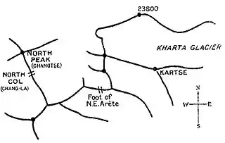 - ↑ The North Col was and is frequently called, Chang La, chang being Tibetan for "north". Now sometimes called Bei'ao