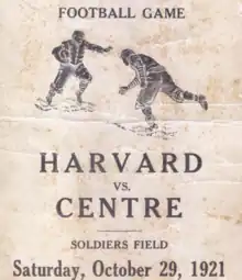 The 1921 Centre vs. Harvard football game was a regular-season college football game played on October 29, 1921, at Harvard Stadium in Allston, Massachusetts. The contest featured the undefeated Centre Praying Colonels, representing Centre College, and the undefeated Harvard Crimson, representing Harvard University. The teams played for the first time the year prior; Centre, led by Charley Moran, shocked many by taking a tie into halftime but ultimately Bob Fisher's Harvard squad took control in the second half and won the game. Centre played well enough to warrant a rematch the following year, and the Colonels, led by quarterback Bo McMillin and halfback Norris Armstrong, again found themselves tied with the Crimson at halftime. Less than two minutes into the game's third quarter, McMillin rushed for a touchdown and in doing so gave the visitors a 6–0 lead. The conversion failed but the Centre defense held for the remainder of the game; Harvard threatened and even reached the Centre 3-yard line at one point but were unable to score. Regaining possession with several minutes remaining in the game, the Praying Colonels were able to keep the ball and run out the clock to secure a six-point victory and maintain their perfect record.