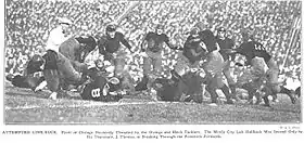 The Tigers had scored a single touchdown in the second quarter, and also the extra point for a total of seven; they then scored two additional touchdowns for 14 points in the final quarter to win the game, while holding Chicago scoreless.[9] With 12 minutes to play and Chicago nursing an 18–7 lead, Howdy Gray of Princeton picked up a Jimmy Pyott fumble and ran it 40 yards for the touchdown. Gray's father, the president of the Union Pacific Railroad, reacted by waving his program in the air, striking a woman in the shoulder.[6][10] After an additional Princeton touchdown was scored, Chicago responded with a fierce drive ending in a goal line stand with Thomas falling short of the goal.[1][11][12][13] Halfback Harry "Maud" Crum scored Princeton's other touchdowns.[14]
